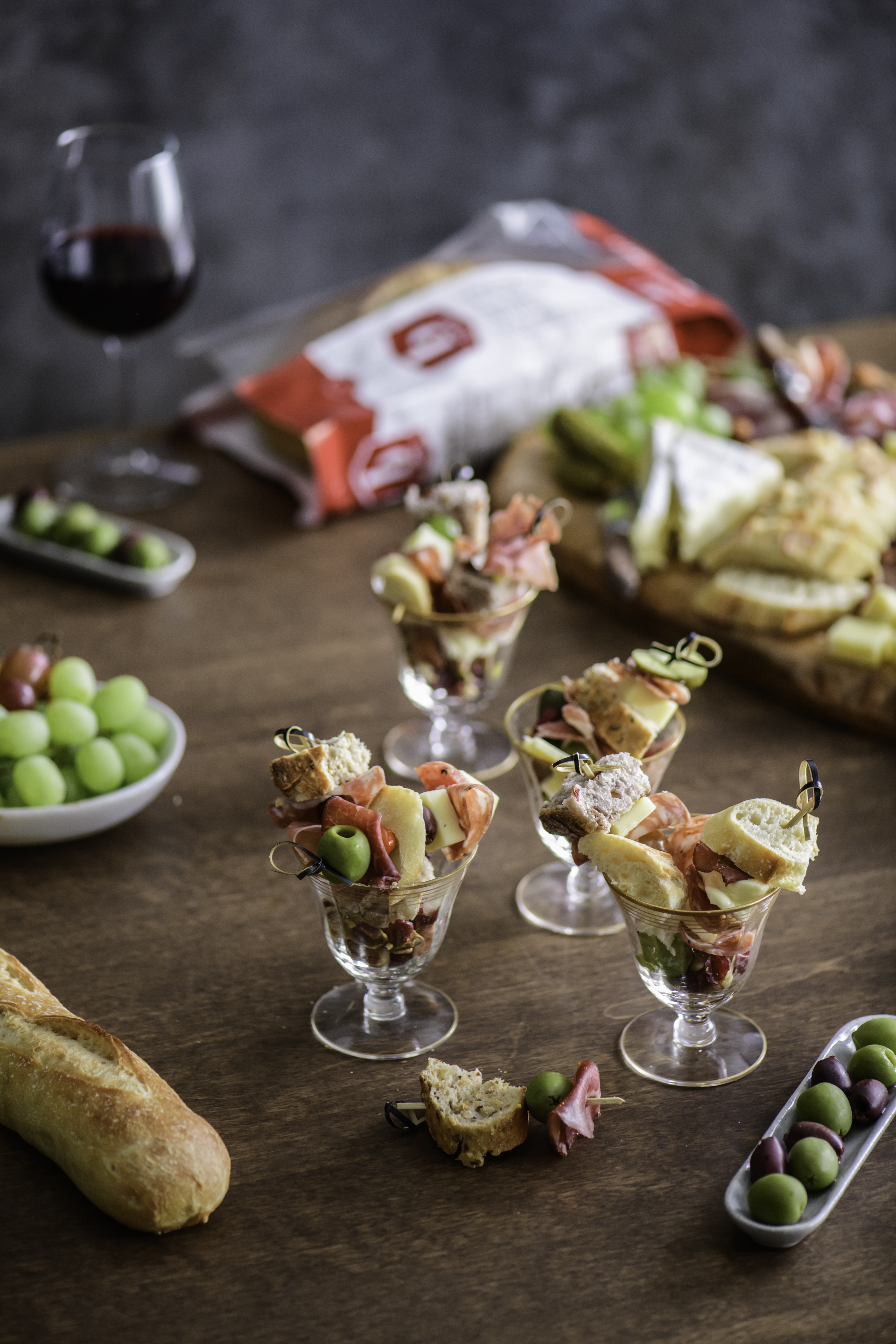 Charcuterie cups are a fresh take on traditional grazing boards. Perfect for open houses, office gatherings, or any event where guests are mingling, these individual servings combine cheeses, meats, fruits, olives, and bite-size pieces of La Brea Bakery bread in a portable and photogenic format.